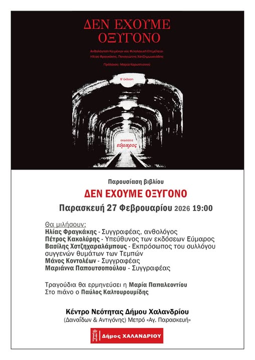 Παρουσίαση βιβλίου «Δεν έχουμε οξυγόνο» (εκδ. Εύμαρος) Παρασκευή 27 Φεβρουαρίου 19:00 Κέντρο Νεότητας Χαλανδρίου (Δαναΐδων & Αντιγόνης) Με αφορμή τη…